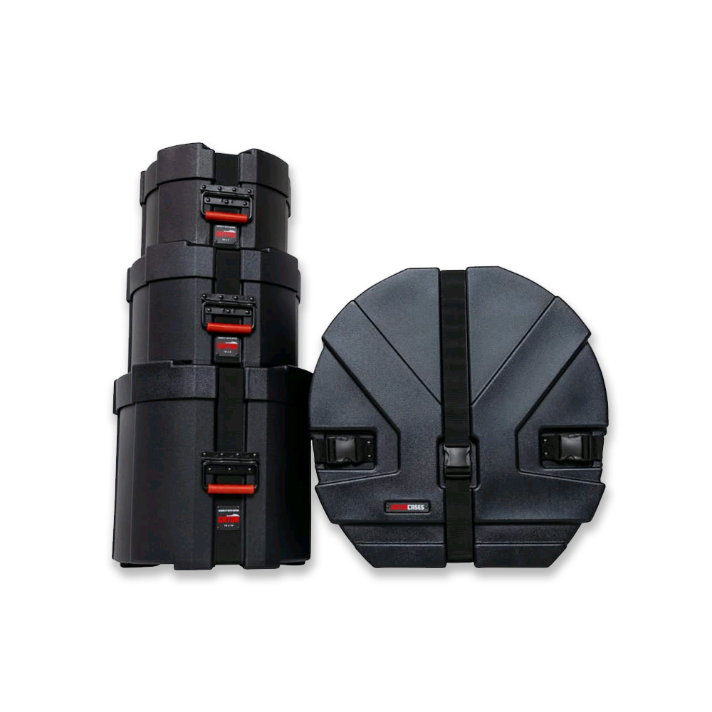 Gator Grooves Roto-Molded Rock Pack includes 22″ x 18″ bass drum case, a 10″ x 8″ and 12″ x 9″ tom case, and a 16″ x 16″ floor tom case.